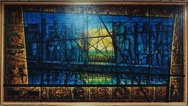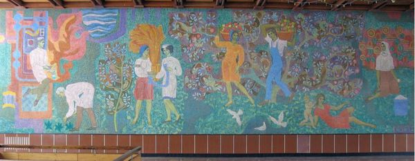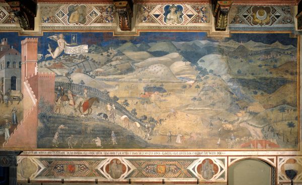 Curator: This is "Departure of the Rooks," a ceramic mural crafted by Nicholas Roerich in 1914. What's your initial take? Editor: Intriguing. There’s an immediate sense of deliberate artistry and skilled craftsmanship. I notice how the ceramic medium itself impacts the final form. There's something about the labor-intensive construction and the repetitive nature of individual tiles, which suggests the human element, the hand involved in the overall scene's rendering. Curator: The modularity imposed by the medium absolutely informs how the narrative unfolds. Observe how Roerich leverages the grid-like structure to segment the pictorial space into interlocking zones, a fascinating tension between representation and geometric abstraction. What structural features particularly resonate with you? Editor: For me, it's about how those zones build into larger scenes and coalesce into a cohesive narrative. The varied blue and green hues create distinct bands across the horizontal axis and capture the rhythm of natural elements within a structured process— a balance I appreciate. I see it less as "geometric abstraction," and more as a reflection of building with raw components. Curator: Ah, yes. But doesn't that structural fragmentation force us to piece together a complete scene in our minds? Note also how Roerich organizes those angular mountain ranges or uses these elongated figures. These compositional choices emphasize design and surface over deep illusionistic space. I appreciate how this echoes a more broadly "Art Nouveau" idiom. Editor: To your point about Art Nouveau, considering this mural in the social context of the era might lead us to explore other interpretations. Its use of standardized, repeatable ceramic units speaks to the era's burgeoning industrial production, but it is rendered here with uniquely personal touches by craftspeople under his direction. Curator: Indeed. We discern here the tensions of early 20th-century aesthetic sensibilities as much as craft is brought forward. This push-and-pull mirrors a broader anxiety about cultural transformation and how traditions must negotiate rapidly changing modern circumstances. Thank you, I think that's a fine note to end on. Editor: Certainly. And this conversation underscores for me the intrinsic value of understanding the means by which this work was brought into existence.
