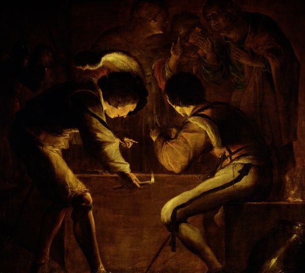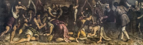 Editor: Palma il Giovane's "The Paschal Lamb," created around 1575, really strikes me with its dramatic use of light. It feels like we’re peeking into a very intimate and important ritual. What’s your take on this piece? Curator: Il Giovane created this historical interpretation of Exodus 12. Think about Venice at this time; this painting highlights their own complex relationship with their powerful trade partner to the east, the Ottoman Empire. In contrast with most painting being done on the Itallian Penninsula during this era, does anything call to mind the visual of Ottoman painting to you? Editor: Well, now that you mention the Ottoman empire, there is an expressive storytelling here. This feels related to miniatures made in modern-day Iran and Turkey. Is that what you mean? Curator: Absolutely! Note how Il Giovane created this dramatic *narrative* style to address Venice’s economic reliance upon their trade relationships with a power which also threatened Venetian authority. Venetian identity here is deeply complicated. How might a narrative help ease public worries? Editor: The storytelling makes something difficult, easier. Curator: Indeed! Through religious and historical references, it's suggesting continuity with a divinely ordained past, almost like saying, "We've been through tough times before, and we'll get through this." So much rides on how we collectively *view* an artwork like this. Editor: I see now that looking at the politics, economics, and anxieties of the time adds a whole other dimension. I'll remember this! Curator: Remember the importance of that socio-political context to a deeper understanding. Thank you!
