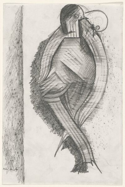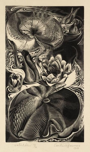 Alexander Raymond Katz created this stark, evocative print titled 'God', using paper and ink. The composition immediately grabs your attention with its dramatic contrast. Angular white lines carve out shapes against a solid black background, giving the image a powerful graphic quality. A stylized eye, framed by what appears to be feathered wings, dominates the upper portion, radiating beams of light downwards. The stark contrast emphasizes the dynamic interplay between light and darkness, a play that destabilizes fixed concepts of divinity. Katz's work, viewed through a semiotic lens, uses visual signs to explore transcendental themes. The eye as a symbol reflects broader philosophical questions about perspective and power, while the minimalist style and absence of detail force us to confront fundamental questions about the nature of existence and perception. The woodcut's design engages with new ways of thinking about space and representation.