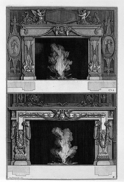 Giovanni Battista Piranesi created this print, "Fireplace with garland frieze applicant and cameos" using etching. The interplay of light and shadow achieved through fine lines gives the fireplace a striking three-dimensionality. The composition, anchored by symmetrical columns and an elaborate frieze, conveys a sense of classical order. Piranesi masterfully utilizes architectural forms to explore themes of illusion and representation. The fireplace, adorned with cameos and garlands, becomes a stage for a play of surfaces and depths. Notice how the fire itself, rendered with dynamic strokes, contrasts with the static, ornamental structure surrounding it. This tension invites us to consider the relationship between the natural and the constructed, the ephemeral and the enduring. The print prompts reflection on how architectural forms can destabilize our understanding of space and perception. It serves as a cultural artifact, reflecting the 18th-century fascination with classical antiquity and the power of representation.