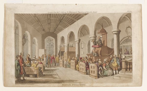 Thomas Rowlandson created this print of "Doctor Syntax voltrekt het huwelijk tussen Dicky Bend en zijn verloofde," sometime in the late 18th or early 19th century. Its architectural setting is defined by soaring arches and a high, stained-glass window, giving the scene a sense of formal grandeur. Yet the arrangement of figures is what truly captures our attention. The composition is cleverly structured to draw the eye toward the central act of marriage. Rowlandson uses contrasting masses—darkly dressed attendees versus the brightly adorned wedding party—to highlight the event’s social importance. His linear style, typical of the period, is evident in the precise outlines and hatching that define form and texture, creating a dynamic interplay between clarity and detail. Rowlandson uses the semiotics of space and form to challenge the fixed meanings of social events, inviting us to reconsider the structures that underpin societal rituals. We're left contemplating the interplay between tradition, individual expression, and social commentary.