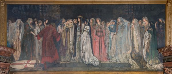 Editor: Edwin Austin Abbey’s 'King Lear, Act I, Scene I' painted in 1898 using oil paint is quite striking. The scene feels dense and theatrical, dominated by reds and heavy costumes. What kind of historical context can you share regarding how it may have been received or interpreted during its time? Curator: This piece arrives amidst a late 19th-century surge in historical painting, often linked to national identity formation and the romanticization of the past. What's curious here is how Abbey uses Shakespeare – already a loaded cultural figure – to tap into discussions of power, loyalty, and perhaps, the anxieties of a changing social order. The museum’s acquisition and display of the piece also plays into how Shakespeare, and particularly *this* interpretation, could become a form of cultural capital. Does the theatricality you mention feel reverent or critical to you? Editor: I think it feels… both? Like it's embracing the drama of royalty but also subtly questioning it. Are there other visual cues that hint at a particular political reading? Curator: Look at the composition. The emphasis on Lear’s performance, alongside the looming, almost spectral figures observing him. It prompts questions: Who benefits from this display? What societal functions does it serve? Furthermore, where might this scene reflect contemporaneous class tensions that existed during its commission and initial exhibition? Editor: That’s fascinating. I hadn't considered how much the act of viewing, both within the painting and of the painting, contributes to its meaning. Curator: Exactly. And reflecting on that role illuminates our understanding, making history come alive again. Editor: I appreciate that deeper understanding, it is very helpful!
