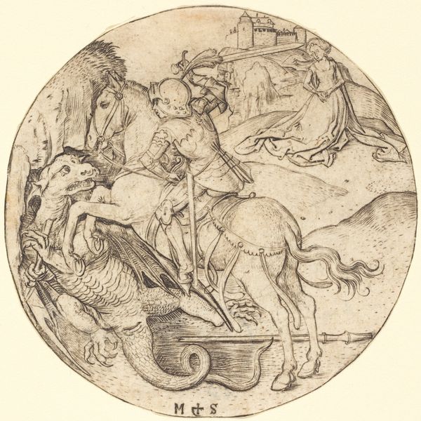 Editor: This intriguing circular piece, "Man Riding on a Steer," is an anonymous drawing at the Harvard Art Museums. I find the texture quite fascinating. What can you tell me about it? Curator: Let's consider the materiality. The ink, the paper, the very act of drawing: these are all readily available materials. It suggests a deliberate decision to represent power, armor, and even nobility, through common means. Is it challenging perceptions of art? Editor: That's a great point. So, it’s not just about the image, but the social implications of its creation? Curator: Exactly. The image and the anonymous labor behind it are entwined. What do you make of the contrast? Editor: I hadn't considered the labor aspect so directly before, but it certainly casts the image in a new light. Curator: Precisely. By understanding how art is made, we understand how it participates in culture.