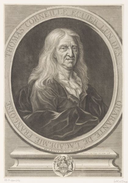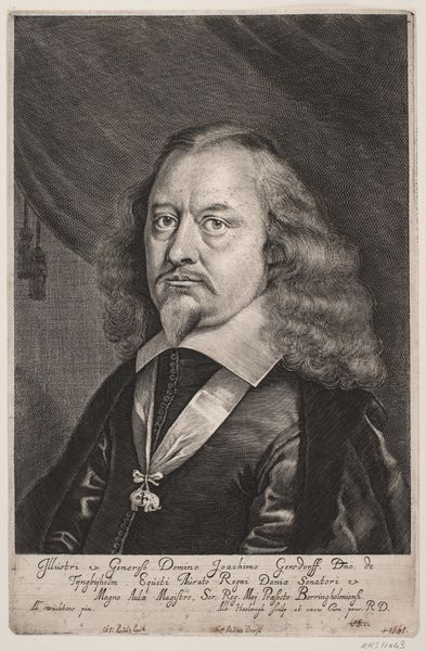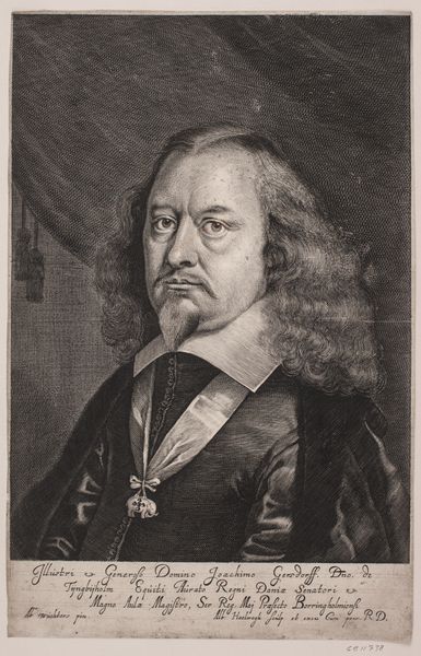 Curator: Welcome! Before us, we have a baroque engraving created between 1655 and 1659 by Albert Haelwegh, currently held at the Statens Museum for Kunst. It's a portrait of Niels Trolle. What strikes you most immediately? Editor: The sheer formality, almost rigidity. It's a very controlled composition using only line to convey a sense of decorum and status. Notice how the stark white collar frames the face, drawing our attention to his expression. Curator: Exactly. Haelwegh clearly used the conventions of portraiture to convey Trolle’s position in society. Trolle was a prominent statesman, and Haelwegh likely produced this engraving as a form of official representation. Prints such as this circulated widely, solidifying Trolle's image and power. The very act of commissioning this says a great deal about his political aspirations and image management. Editor: Yes, and technically, the precision of the engraving is remarkable. Look at the rendering of the light on his face and the meticulous detail in his lace collar and hair. The varying thickness and density of the lines give the impression of light and shadow despite the monochrome medium. Curator: And the Latin inscription. It highlights Trolle’s titles, underlining his authority as senator and governor, which serves to confirm the image’s purpose as a carefully crafted piece of political communication. Think of the choices involved - the costume, the pose, the controlled, almost severe expression – each carefully selected to project power and influence. Editor: You're right. However, looking closer, the expression in his eyes seems softer than you might expect. It gives him a sense of humanity, almost vulnerability, in spite of the formality. Curator: That’s an interesting point. It serves as a subtle reminder that even the most powerful figures are ultimately human. Editor: A nice observation of both subject and context! It really does give one an appreciation for how complex something as seemingly straightforward as a portrait can be.