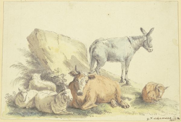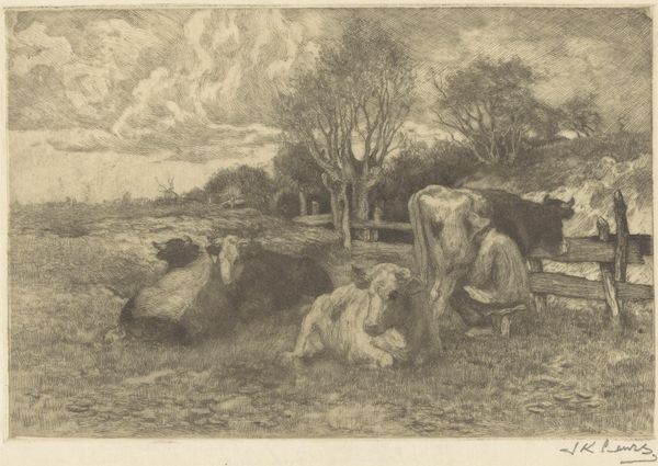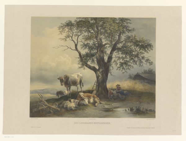 Simon van den Berg captured this watercolor of a landscape with cattle and sheep. It is an idyllic scene dominated by the presence of domesticated animals, and the twisted, hollow trunk of a large tree, a symbol of nature's enduring strength. The image of cattle has ancient roots, appearing in cave paintings as symbols of fertility and sustenance. The prominence of the cattle is reminiscent of ancient pastoral scenes, where livestock represented wealth and prosperity, a tradition stretching back to ancient Greece. The motif of a tree trunk, as seen here, appears in countless artworks, bearing witness to the passage of time and the cycles of life. The way these animals rest peacefully may evoke feelings of nostalgia, inviting us to connect with a simpler, more harmonious existence. This image is a powerful force that speaks to our subconscious desires for a connection with nature. It reminds us of the ever-evolving dialogue between humanity and the natural world, echoing through the annals of art history.