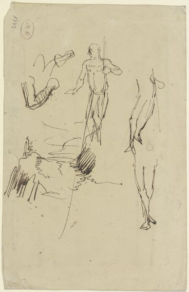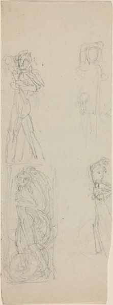 Curator: This drawing, aptly titled "Five Elves," comes to us from Paul Konewka, dating circa 1867 to 1868. It’s rendered on paper in Städel Museum's collection. Editor: It has this light, almost ethereal quality. The linework is delicate, almost like whispers on the page. The composition too, feels dynamic; figures suspended and posed. It brings this immediate sense of joyful movement to my eye. Curator: Konewka’s career saw him gain considerable popularity for his silhouette illustrations, gaining significant traction through publications like those of Goethe and Shakespeare. The artist used fairy tales to express and engage in the world, his romantic visions finding resonance amongst those grappling with rapid industrial change in Germany. Editor: I find it curious to see the use of light and shadow here – sketchy but present nonetheless. Consider how the implied light source shapes these forms; the soft modelling accentuates their ethereal quality. Curator: Sketches such as this gave agency to these stories and fairy tales; providing agency and even subtly addressing class divisions through fantastical representation and artistic consumption. Editor: Speaking of the fantastic, observe the elusiveness in the character sketches: notice their miniature forms, childlike qualities combined with suggestions of wings…it taps into a rich tradition of allegorical representation of lightness in visual terms. The lack of strong details almost pushes it closer toward dreamscape. Curator: Right, and during this time, fairy tales and folklore experienced something of a revival. Konewka taps into the public's thirst for such material but then disseminates this material and subjects of German national pride through his commercialized art. Editor: Absolutely. Examining Konewka’s marks more broadly – we see an interesting push and pull of negative space. Where is mass suggested, and how does the minimal definition enhance a playful tension? Curator: Yes! These sketchbook pages reveal Konewka's creative process—blurring the line between folklore and political identity. A crucial contribution to art’s broader societal influence. Editor: Seeing "Five Elves" has heightened my focus on Konewka’s linework and handling of light; bringing new insights and appreciation to the image overall. Curator: And it reveals much about the public's romantic fascination with folklore. A reminder of art’s dialogue with socio-political moods during times of intense transformation.