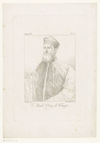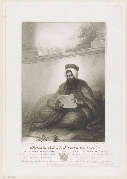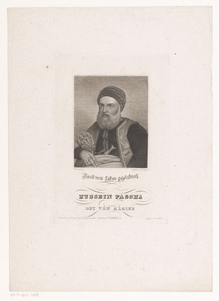 This is Ferdinand Bahmann’s monochrome print “Portret van Hussein, dey van Algiers.” The portrait, contained within a rectangular frame, presents a symmetrical, almost stoic depiction of Hussein. The composition focuses on the detailed rendering of Hussein's features and attire. Note how the artist uses intricate lines to define the textures of his beard and turban, as well as the rich embroidery on his vest. The symmetry in the composition suggests power and formality. The semiotic system at play here is one of imperial representation. The subject's gaze, the objects he holds, and his elaborate clothing signify authority. Yet, these symbols are mediated through the European artistic style, creating a visual dialogue between cultures. This print functions as a complex sign, reflecting the historical and political tensions between Europe and Algiers, even as it invites ongoing interpretation.