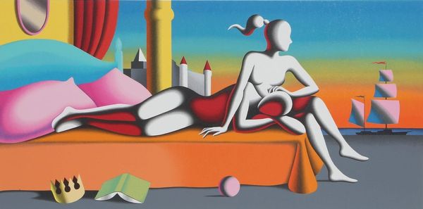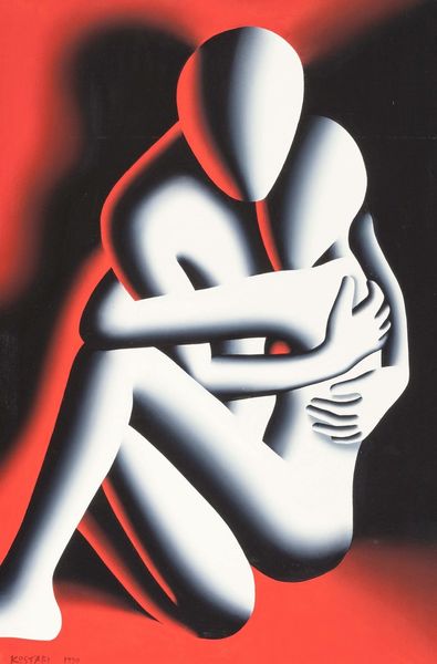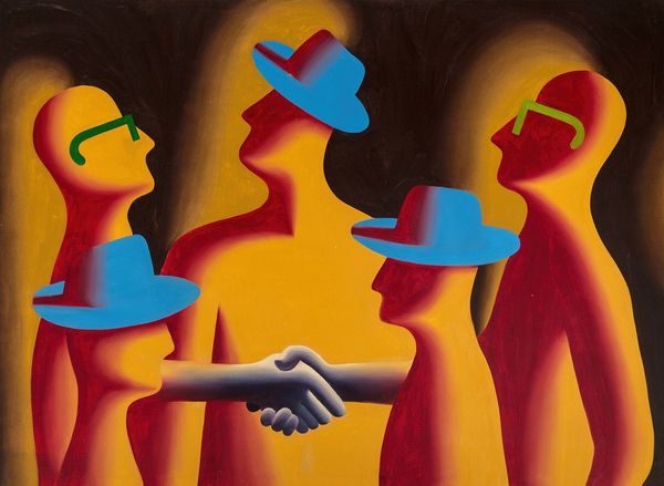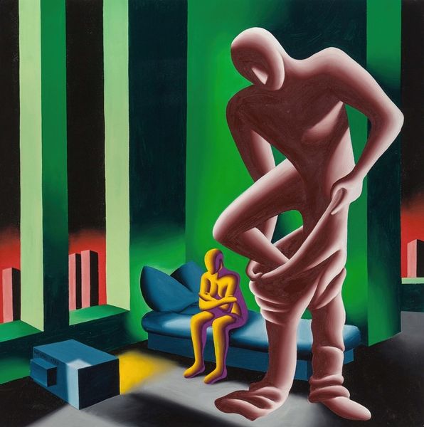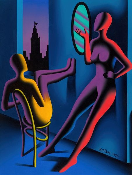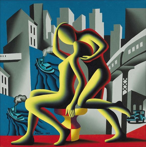 Curator: This is "The Enigma of Desire," painted in 2021 by Mark Kostabi, known for his contemporary pop-art style with elements of surrealism. It's an acrylic painting, fairly modest in scale, wouldn't you say? Editor: The title itself feels like a gentle tease, but that sky! That unapologetic, gradient, radioactive green pulls me in, even before I get to the kissing couple. It’s got a definite theatrical, almost artificial, dreamlike quality. Curator: Absolutely, it exemplifies how Kostabi's work frequently uses dreamlike environments. Note how the figures are largely devoid of distinct features. They almost become archetypes of a universal yearning, amplified by that bizarre city background. It recalls de Chirico, somehow. Editor: Yes! Those mannequin-like figures amplify the sense of distance, or anonymity perhaps, despite the palpable embrace. Are they in love, or are they stand-ins for… well, everyone? The colors certainly clash in a compelling way – that intense blue structure… a backdrop, a fortress, maybe even a cage for desire? Curator: You are right about Kostabi wanting to portray anonymity through his human figures. He sought to eliminate personal expression. This detachment, along with his factory production methods involving multiple assistants, actually courted critique for a perceived lack of originality. Editor: But perhaps that very act becomes part of the statement, right? Taking art production into almost factory setting—if this resonates for you, let’s just stop there for a moment. Because there is plenty here that deserves longer thought! I have so many questions...are we observing genuine emotional engagement, or is the embrace purely performative? Curator: That’s a key question. He mirrors our culture of constant performance and asks questions about our roles within this reality. Does art really need the hand of an individual “genius”, or can creative work express modern mass media by taking advantage of multiple perspectives? Editor: Indeed, "The Enigma of Desire," a modern love story viewed through a cracked mirror. Love in the era of mass production! So, take some moments with Kostabi and consider what's hidden—and displayed—beneath the vibrant façade.