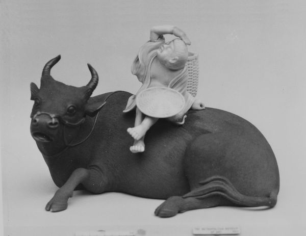 Curator: Welcome. We're looking at "Water Buffalo with Boy," a charming ceramic sculpture from around 1745-1755. It’s currently residing here at the Metropolitan Museum of Art. Editor: It’s delightful! There's something so serene about it. The subdued glaze and that chubby little figure really create a sense of gentle playfulness. Curator: Indeed. The 'Whieldon type' pottery technique, employed in this sculpture, involves combining different colored clays to create a mottled, almost marbled effect. It's particularly interesting when you consider how it allowed for mass production while still maintaining a degree of uniqueness in each piece. The level of craftsmanship points to sophisticated workshop practices that supported both decorative arts and a wider market. Editor: Right, but beyond its mode of production, that water buffalo has resonated for centuries across diverse cultures. It symbolizes strength, reliability, and prosperity. In many Asian traditions, the buffalo is also connected with farming, abundance and a closeness with nature. Then the addition of the boy. A symbol of familial prosperity? A wish for the continuation of the family name? Curator: It's all intertwined, isn't it? The water buffalo served agricultural economies for centuries, representing labor and sustenance. Ceramic pieces like this likely moved beyond the rural, agrarian settings, finding their place in wealthier homes. It's fascinating how the ceramic allows this symbol to move to completely different contexts. Editor: Agreed, and the sculpture presents a simplified version of idyllic rural life. Look at the boy, his confident seat, juxtaposed with the massive buffalo. Its gentleness isn't about reality, but a projected harmony that echoes across the cultural imagination. It is so compelling. Curator: Certainly. Its beauty lies as much in the skills of production and the context of consumption as in any perceived symbol. I’m struck by the blending of utility, commerce, and symbolic representation into this single decorative object. Editor: For me, the sculpture whispers about harmony and cultural continuity through visual representation. I wonder, still, what that little boy represents to each of us. Curator: Yes, food for thought. I suggest we move on to our next piece.