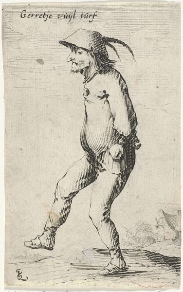 Editor: This is *Haveloze boer gekleed in lompen*, a black and white etching by Cornelis Danckerts from the Dutch Golden Age. It’s held here at the Rijksmuseum. The figure seems so defeated, but stands with an almost defiant pose. What catches your eye, and how would you interpret it? Curator: It's intriguing how the etching embodies a visual language reflective of its era. Consider the figure’s tattered clothing, symbolic of poverty but rendered with a degree of dignity. Doesn't it remind you of similar depictions from the same period? This image plays into common tropes in art to elicit pity and suggest sympathy, whilst being critical of this person's lifestyle. It reflects societal anxieties of the time. What kind of continuity do you observe in visual representations of social status in art, stretching back to earlier eras or even ancient art? Editor: That’s fascinating, I hadn't thought of it that way. I was too caught up in the surface reading, how literal the description seems. To what extent did printmakers in this era aim to offer accurate portrayals, versus presenting morality tales, or even just commercial objects? Curator: That is indeed the crux of understanding works of this period! Printmaking served myriad functions. Here, we see not merely a literal rendering, but perhaps also a commentary on wealth and poverty, and even ideas about work and charity, depending on the artist's or the audience's perspective. Consider also the distribution of light and shadow - does it serve solely to depict form, or might it be imbued with deeper symbolic weight? Editor: I guess I never considered how potent symbols can be, especially in prints like these, which can communicate so broadly and quickly to viewers. The ability to convey messages to such a wide audience would have been incredible in this period! Curator: Indeed! And now you have glimpsed, perhaps, how an image can be more than just a picture; it becomes a carrier of cultural memory, an active participant in dialogues across centuries. Editor: I'll certainly be looking more closely at prints now! I appreciate this new perspective.