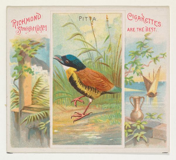 Editor: This is the "White-Throated Shag" print from the "Birds of the Tropics" series, created in 1889 for Allen & Ginter Cigarettes. The bird has such vibrant coloring; its plumage feels very alive. How should we interpret a piece like this? Curator: Given its context as a cigarette card, we need to consider the interwoven narratives of colonialism, commerce, and exoticism. These cards circulated widely, embedding a specific, often romanticized, view of the world. What does the phrase "Birds of the Tropics" evoke for you? Editor: I suppose it creates a sense of wonder but also distance—like these birds are somewhere far away and unreachable for the average person. Curator: Exactly. This remoteness naturalizes the exploitation of both the natural world and the people inhabiting these "tropical" regions. The card presents an idyllic scene while obscuring the realities of resource extraction and imperial expansion facilitated by companies like Allen & Ginter. The printing process is also crucial; think about the labor involved, who benefited, and who was excluded. Where were the raw materials sourced? Who created this artwork, and what was their positionality? Editor: So it’s not just a picture of a bird. It's a product of its time, complicit in larger power structures. Curator: Precisely! By understanding these intersectional narratives, we can decode the embedded ideologies and begin to unpack our own relationship to this history. It's about questioning the seemingly innocuous and revealing its underlying complexities. Editor: That makes me think differently about collecting things – whose stories are really being told? Curator: And who is being silenced in the process. Reflecting on this shifts our perspective.