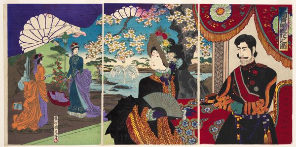 Curator: This vibrant triptych is titled "Chrysanthemums at Court" by Yoshu Chikanobu, part of the Harvard Art Museums collection. It's printed on paper with dimensions of about 14 by 29 inches. Editor: Whoa, the explosion of colors! The mums steal the show, don’t they? Like a garden colliding with high society. It feels both grand and slightly…staged? Curator: Indeed. The chrysanthemum, or "kiku," held a prominent position in Japanese culture, often linked to the imperial family. These blooms symbolize longevity and rejuvenation. Editor: So, the court’s basically basking in a botanical fountain of youth? I dig that. And the Western-style dresses! It’s like two worlds waltzing together, a bit awkward but intriguing. Curator: Precisely. Chikanobu masterfully marries traditional Japanese printmaking with the Western influences of the Meiji period, reflecting the era’s rapid modernization. Editor: I love that the composition creates separate spaces, like little stage sets, and the eye meanders. It's a celebration of culture clashing yet still in harmony, if that makes sense. Curator: It does, beautifully. It's fascinating how symbols—like the chrysanthemum—can be both emblems of the past and signals of a future yet to unfold. Editor: For me, it's a quirky, charming collision of cultures—a historical snapshot with a bold floral filter. It left me with a grin.