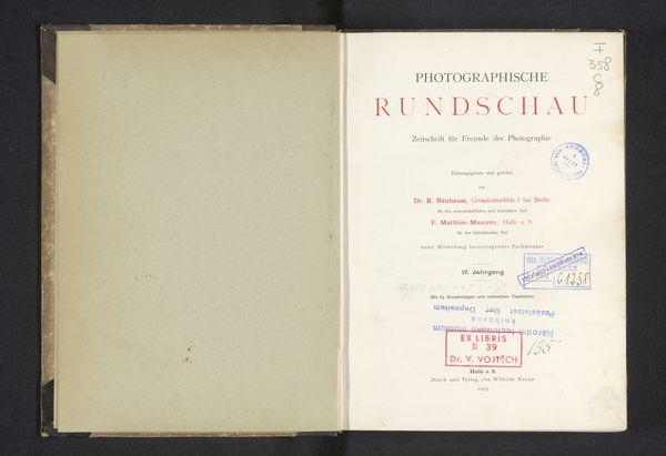 Editor: So, this is "Photographische Rundschau: Zeitschrift für Freunde der Photographie" from 1901 by Richard Neuhauss. It looks like a printed journal, maybe using a photographic process for the typography? It has this wonderful open spread with very aged paper. What draws your attention when you look at this journal's spread? Curator: I'm drawn to the visual language embedded in the piece, its power lies less in a single image and more in its evocation of cultural memory. Art Nouveau emerged as a distinct style precisely around the turn of the century and its symbolic language permeates through its organic forms, decorative typeface, and presentation of photography itself as a new, almost mystical, technology. Do you feel the subtle but distinct symbolic power conveyed through the image's design? Editor: I do! It feels very self-aware, almost like it's announcing the future importance of photography. So, is the design itself part of the "artwork," not just a presentation? Curator: Precisely. This era, people thought about the total work of art. Design wasn't merely functional. The typography, layout, even the aging of the paper, it all contributes to this feeling of reverence and excitement about photography’s possibilities, an entire culture displayed through symbolic order. Editor: It's like the journal is a time capsule itself, not just preserving photos, but a feeling about that time. I appreciate noticing how the visual language helps capture and convey the feeling surrounding the rise of photography. Curator: Exactly, these visuals aren’t static, they actively shape our perception of history. A great way to approach how symbolic meanings evolve over time.