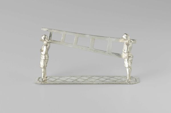 Curator: "Twee Zagemannen", or "Two Sawyers," created by Pieter van Somerwil around 1718 to 1734, is a miniature tableau crafted in silver. What's your initial take? Editor: It feels stark, almost industrial. The cool gleam of the silver against the composition. It highlights labor, doesn’t it? Making the act itself precious. Curator: Precisely. Think about the context of its creation. Silver as a medium elevates what was considered low labor into the realm of luxury. Two sawyers in baroque? The sharp detail! Editor: Van Somerwil seems interested in portraying everyday people. But through a filter, obviously, I wonder if there's something here about labor, and access to these high status materials? Curator: Well, yes! Silver work like this isn't just about showing skill. It's about demonstrating mastery of resources, specifically silver, through labor. It asks questions about social hierarchies too! It presents to us something otherwise gritty in pristine metal. Editor: The labor is now decorative; its inherent nature obfuscated. But even at this miniature scale, that act is present; perhaps it brings some focus on the exploitation within labor itself. Was Van Somerwil exploring this divide? Curator: That’s something to contemplate. His attention to detail, how light catches the hammered texture, even on the plank itself... these elements become essential. The sheer amount of labor. Editor: I notice how the relative lack of contextual setting puts a lot of focus on the labor and how that labor itself impacts how social structure impacts. How the art-world views what constitutes worthy subjects! And perhaps, how social progress changes the world, especially its workforce. Curator: So true! This work becomes more than just decoration or skill. The use of expensive silver calls attention to material conditions. A baroque artist creating miniature metal-work about laborers gives a fascinating picture into contemporary context. Editor: Agreed. I initially saw a straightforward image but now notice it offers a lot. And that, to me, is why we still come to art like this. To see past our first glance. Curator: Indeed. The layered complexities invite conversation. I find new points of view here that allow one to see more fully how class and value intersect with craftsmanship and the artworld itself.