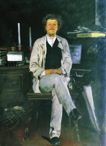 Editor: Lovis Corinth’s “Portrait of the Pianist Conrad Ansorge,” painted in 1903, gives us a glimpse into the sitter's world, but it’s the oil paint itself that catches my eye. The way Corinth applies it, almost raw in places, really speaks to the energy of the subject. What stands out to you? Curator: The visible brushstrokes are exactly where I’d start. They aren't just a stylistic choice. Think about what it means to represent someone like Ansorge, a celebrated pianist, in this manner. The painting foregrounds the physical act of its making. How does the process of depicting the pianist become a key element in understanding his profession, also an act of production? Editor: So, the painting itself becomes a performance, similar to a piano recital? The visible labor connects to the labor of the pianist? Curator: Precisely. And consider the social context. Corinth is challenging the traditional hierarchy between high art – portraiture of important figures – and what was then considered mere craft, the manipulation of materials. The oil paint becomes a tool, almost like a pianist's fingers on the keys. Editor: That's fascinating. It never occurred to me to see the materiality of the paint as such a vital link between the artist and the subject, as it’s not merely representational. The painting’s medium thus also serves as commentary about Ansorge's life. Curator: Absolutely. And, in a way, Corinth anticipates a shift in how we value artistic production, placing emphasis on process and the materiality of art itself, as labor becomes visible. This creates new social and aesthetic implications for both artist and subject. Editor: I’ll definitely view Corinth's work differently now, thinking more about labor and its impact. Thanks! Curator: My pleasure. Looking at art this way helps reveal hidden aspects of the piece and of history itself.