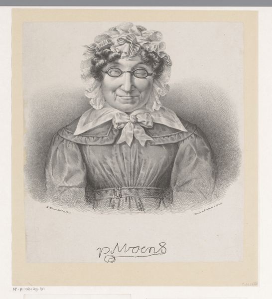 Curator: Welcome. Here we have a drawing called "Portret van Petronella Moens," dating from sometime between 1822 and 1845. The medium is pencil. Editor: It's incredibly delicate. Almost spectral. The subject's features are so finely rendered in pencil, giving it an ethereal quality. I'm curious about the paper; the texture adds a lot. Curator: Well, the pencil itself is interesting, isn’t it? Consider that the very composition of the "lead" is, of course, graphite. It leaves its own residue as it transforms intention into a graphic image. It's the residue of labor! Editor: Right, and you see it too in the style of dress; she's wearing that sort of utilitarian cap, isn’t it? Though the large bow at her neck provides the image with a touch of formal attire and domesticity. Curator: She does! Her spectacles suggest intellectualism, but perhaps also vulnerability, inviting a tender gaze rather than a critical one. Editor: Absolutely, the details like the bow and cap are rendered with so much care. This challenges assumptions about "lowly" material--the way it elevates a domestic scene into something worthy of close aesthetic consideration. I mean, her presence is captured almost heroically in that cap! Curator: You know, caps such as those often signal modesty, and that's so telling, especially given the rise of female writers in the Netherlands at that time, signaling piety or quiet confidence in their place in a changing world. Editor: It brings up an interesting paradox. This image has such a weight of class markers and yet the simplicity of graphite brings it into reach of so many different levels of class. It opens up all kinds of interpretive potentials, doesn’t it? Curator: Indeed, an understated icon, speaking volumes through her presence, and what can be implied from dress alone! Editor: An interesting drawing; so much packed into simple lines.