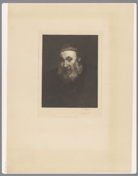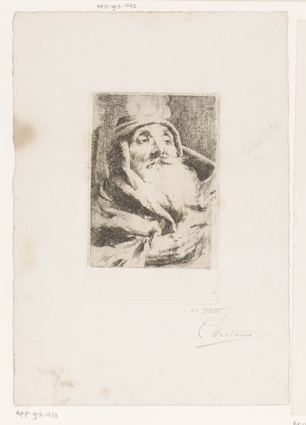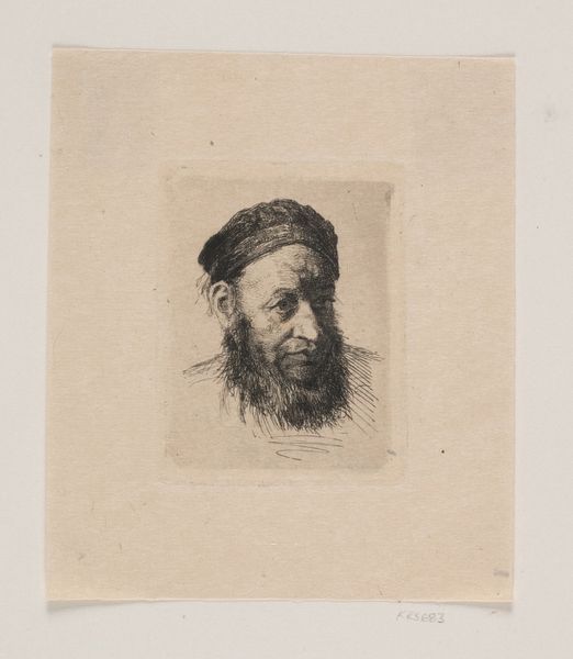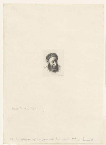 Editor: Here we have Carl Bloch's "Mannekop met lange baard en muts" from 1885, rendered in pencil. It strikes me as a very direct, almost confrontational image. The gaze is quite intense. What can you tell me about this work? Curator: This drawing, like many portraits, functions almost as a mirror, reflecting not just the subject, but cultural notions of wisdom and age. The long beard, historically and symbolically, signified maturity, experience, and even divine connection across cultures. It recalls the visual tropes of philosophers or prophets. Notice how the artist emphasizes the lines around the eyes. Editor: Yes, that's it. I'm getting the wisdom of the ages. The downward-pointing hat has me wondering though. Is it also symbolic, or is it simply what he was wearing? Curator: The cap could represent a humbler status or perhaps a scholarly affiliation. Head coverings often signified roles within a community or spiritual order. What does the gaze convey to you? Editor: There's an awareness there, but I think it’s somewhat melancholic. A weight of history. Curator: Perhaps. Bloch may be tapping into archetypal images of learned elders while imbuing the sitter with individual emotion. The contrast between the meticulously rendered face and the sketchier rendering of the beard and clothing – does that suggest anything to you? Editor: I guess it speaks to what Bloch wanted to say. That the message isn’t in the details, but the essence. This has been insightful. Thank you. Curator: Indeed. Every stroke carries the weight of intention and historical understanding. It leaves me contemplating on the ongoing human desire to find meaning and connection across generations.
