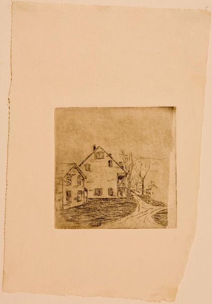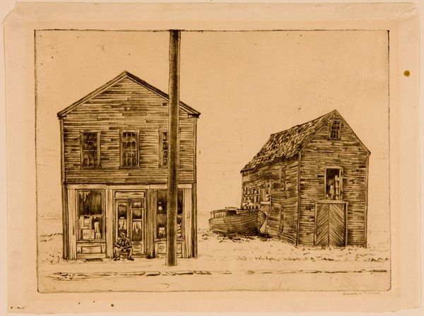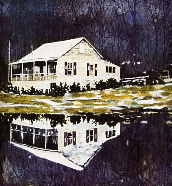 Curator: Here we have Peter Doig's "Camp Forestia," a print held in the Tate collection. What strikes you upon viewing it? Editor: It feels like a half-forgotten memory. The hazy quality, the reflection... It's like a dream dissolving at the edges. Curator: Observe how Doig employs a restricted palette, allowing the structural elements to dominate. The horizontal lines of the wooden house contrast with the murky verticality of the reflected forest. Editor: Yes, and that lone figure. It could be anyone, or no one. I love how the indistinct forms allow for such open interpretation. Curator: Indeed. The interplay between the representational and the abstract creates a compelling tension, doesn't it? Editor: It does. It makes you wonder what's real and what's imagined. A fleeting moment captured, then faded away. Curator: A fitting interpretation of memory itself, wouldn't you say? Editor: Absolutely, and the quiet stillness of this print speaks volumes. I feel invited to linger in this space.