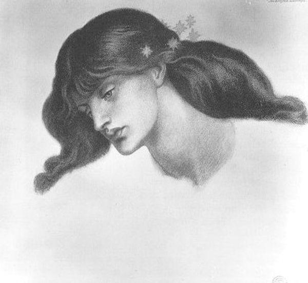 Curator: Here we have Dante Gabriel Rossetti's Portrait Head of Jane Morris, held at the Harvard Art Museums. Editor: The subtle shading gives it an ethereal quality, almost as if she’s emerging from a dream. Curator: Rossetti immortalizes Jane Morris, a Pre-Raphaelite muse, capturing her iconic beauty. Her features and flowing hair became synonymous with a particular aesthetic ideal. Editor: The texture of her hair contrasts beautifully with the smooth, elongated neck—it creates a compelling tension. The composition is simple, yet elegant. Curator: Indeed. He's tapping into a visual language linked to classical ideals of feminine beauty, echoing goddesses and mythical figures that resonate through centuries. It’s a deliberate construction of an icon. Editor: It's remarkable how such a limited color palette—essentially black and white—can evoke such a potent sense of romanticism. Curator: This piece reminds us how visual symbols can embody cultural memory and shape our perceptions of beauty and identity. Editor: Exactly, and how the artist's choices—composition, tone—can be incredibly powerful in shaping those perceptions.