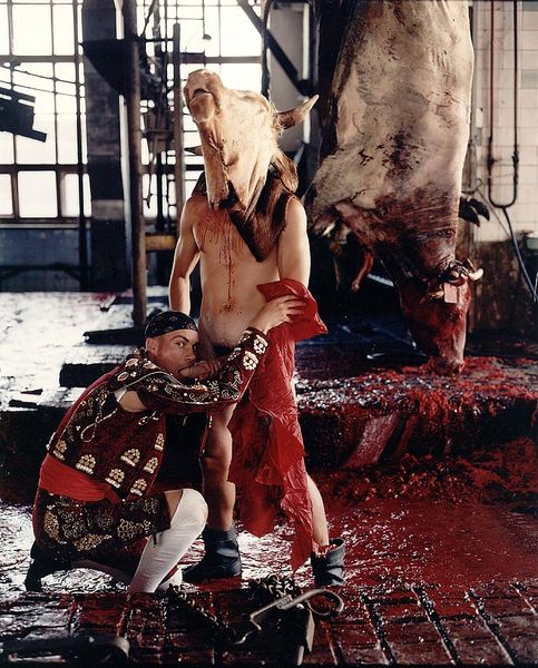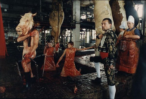 This is Arsen Savadov’s ‘Collective Red’. When it was made, I'm not sure, but Savadov was born in 1962. I'm struck by how the visceral and theatrical are brought together here. The red isn't just a color; it's practically a character in itself. The blood-like substance coats everything, becoming a kind of painterly gesture that obscures the surface. The texture and the light… they're intense, but almost painterly, like a Caravaggio. The heavy, dark shadows mixed with the slick, reflective surfaces create a space that's both real and imagined. Notice the way the light catches on the bodies. It’s like a macabre dance of flesh and shadow. It really reminds me of the work of Joel-Peter Witkin. Savadov invites us to confront discomfort and to find a strange beauty in the grotesque.