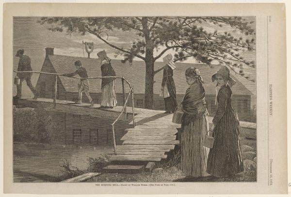 Winslow Homer created this wood engraving, "The Morning Bell," for Harper's Weekly. The year it was made, 1873, Reconstruction was underway after the American Civil War. Homer often depicted rural life and labor. Here, we see figures crossing a bridge towards a factory, presumably heading to work, with women in the foreground. The stark light and shadow give a sense of somberness, hinting at the lives of the working class. The women carrying what appear to be lunch pails represent a departure from traditional depictions of women in domestic roles, but also emphasizes the realities of gendered labor. The artist presents a narrative of labor that invites viewers to reflect on the emotional and physical toll of industrial work. Homer neither glorifies nor romanticizes this scene, instead offering a glimpse into the everyday experiences of ordinary people. It is a powerful statement about the changing social and economic landscape of America.