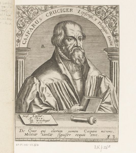 This engraving, made by Theodor de Bry around the late 16th century, depicts Christoph Herdesianus, a syndic from Nuremberg. The image, produced in the Netherlands, offers insight into the cultural values of the time. The portrait is framed by architectural elements and floral ornamentation, visually elevating the status of the sitter. His fur-lined robe and elaborate ruff signify wealth and social standing. The books and writing tools on the table allude to his profession and intellectual pursuits, whilst the Latin inscription emphasizes his education and connection to classical tradition. The Netherlands during this period was undergoing significant social and political change, especially within the realm of religious reform. Engravings such as this played a role in disseminating ideas and reinforcing the social order by portraying figures of authority. To fully understand the context of this portrait, a historian might look to period texts, genealogical records, and studies of costume and social customs. The image thus becomes a window into the world of 16th-century European elites and their relationship to learning, status, and power.