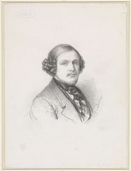 Curator: Welcome. Today, we’re examining "Portret van Petrus van Schendel," a pencil drawing completed in 1841 by Coenraad Hamburger. Editor: My first thought? Melancholy. The soft, almost blurry lines lend an air of quiet introspection. It’s striking how the artist achieved such a depth of emotion using just a pencil. Curator: Hamburger's choice of medium speaks to broader trends. The availability and affordability of graphite pencils during the Romantic era meant that art creation wasn’t limited to elites with access to oil paints. This opened portraiture to a wider audience, reflecting the values of burgeoning middle class. Editor: But consider the meticulous technique! Notice the cross-hatching and delicate gradations in tone—particularly around the subject's face. It’s these formal elements that give the work its character, an interesting harmony between precision and the gentle blurring. Curator: True, but consider also the sitters garb and the role they played in Romanticism, or Schendel specifically; one known to make many nocturnal paintings—it’s the illumination in this piece. Look at where it hits the face and where he obscures certain features, particularly his dress clothes. This suggests how it might have been manufactured. Editor: Agreed, but don’t you think his placement creates a wonderful asymmetry that enhances visual interest? Curator: Maybe. I also notice the slight upward gaze – a standard trope. Was he instructed to look hopeful? The social position comes into play—as though painting isn’t enough to say what’s required here! Editor: Still, despite these conventions, there's an undeniable vulnerability in the subject's expression. Hamburger managed to capture more than just a likeness; he's revealed a trace of something deeply personal within the artist. Curator: I see your point about the emotive quality. For me, it comes down to how art-making itself became democratized. It adds richness that's more than technical virtuosity alone! Editor: Yes. Together, these elements reveal that even simple materials, through skilled manipulation, can render complexity of Romantic personality.