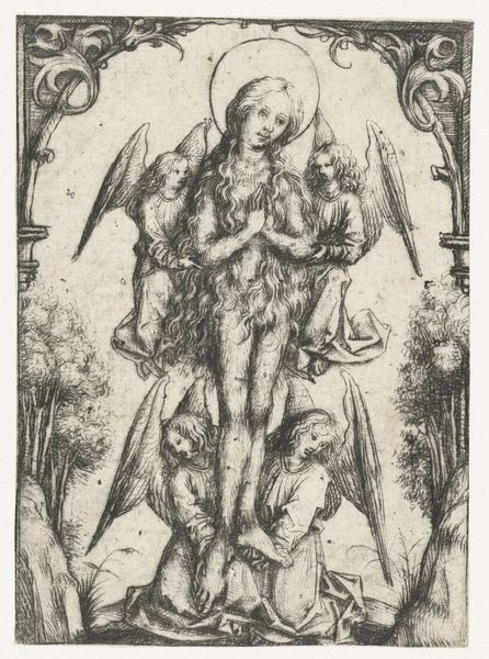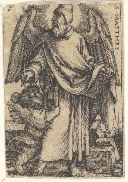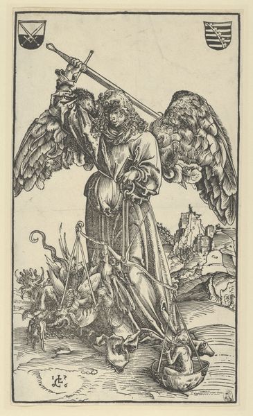 Curator: Our focus now shifts to "Heilige Michael," or "Saint Michael," an engraving rendered in ink around 1488-1492 by the artist known as the Master of the Amsterdam Cabinet. Editor: A powerful image! The dynamism is striking, even in such a small, monochromatic work. The lines seem to vibrate with energy. Curator: Precisely. The artist masterfully employs line work to create depth and texture. Note the contrast between the smooth, flowing lines delineating the angel's drapery and the short, hatched strokes used to depict the demon's grotesque form. The angel, a beacon of idealized beauty, stands in stark opposition to the beast he vanquishes. Editor: Beyond its aesthetic impact, consider the socio-political implications. The depiction of St. Michael triumphing over evil served as potent propaganda. The imagery would have reinforced societal hierarchies and the power of the church, wouldn't it? This print, circulating widely, amplified these messages in ways previously impossible. Curator: Undoubtedly. And observe the symbolic weight embedded within the composition. The angel, armed with both spear and sword, embodies divine authority, literally towering above the grotesque demon, itself a visual shorthand for heresy and social disorder. Look also at the God figure with angels in the upper section of the artwork looking down from above, implying holy blessing upon the character. Editor: The placement of that figure is really telling. The way that authority and hierarchy are structured spatially, too. I think the effectiveness of its propaganda stemmed directly from the ability to transmit such potent symbols widely during a period of rapid change and social unrest. The print’s impact wasn't simply aesthetic. Curator: A critical point. Consider the act of production too. Printmaking facilitated a wider distribution of artistic ideas and themes; It was a new public role of art. What’s left to the viewer is a testament to both spiritual conflict and technological advancement. Editor: It reminds us how visual forms and distribution networks shape societal perceptions of authority and transgression. Thanks, an enlightening artwork to explore through the lenses of composition and cultural force. Curator: Indeed, the marriage of form and context reveals just how powerful visual language can be. Thank you, it's amazing how much impact a pen, ink and printing press can give an artist.