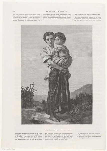 Curator: Here we have Bartolomeo Pinelli's print, "Female from Procida," held at the Harvard Art Museums. There's an immediate feeling of melancholy that emanates from the image, doesn’t it? Editor: Yes, it does. The starkness of the etching, the heavy lines used to depict the woman's clothing... it all conveys a sense of hardship, amplified by her gaze. Curator: The headscarf, in particular, suggests a cultural marker, a signal of her identity firmly rooted in Procida. It’s almost iconic in its depiction of motherhood. Editor: Agreed, and the artist’s lines are fascinating. Note how the landscape fades into the background, almost secondary to the figure's presence. It’s a study in contrasts, the rough terrain with the woman's soft features. Curator: It’s a powerful encapsulation of a time and place, a visual echo resonating across centuries. Editor: Indeed, an evocative piece that speaks volumes with its simplicity.