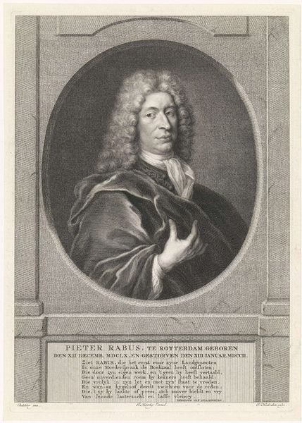 Curator: This engraving by Jacobus Houbraken depicts Pieter Rabus. The medium itself speaks of a certain level of accessibility during that era. Look at the paper's texture, the ink used. Editor: Yes, the material reality is fascinating, but I'm struck by the composition—the subject's gaze, the subtle hand gesture. It evokes a sense of intellectual contemplation, inviting dialogue on societal values. Curator: I agree. The very act of creating this portrait, of memorializing Rabus in ink, highlights the importance of intellectual figures in the public consciousness, something that resonates across different social contexts even today. Editor: And how the etching process allowed for dissemination. It wasn't some unique canvas locked away for only elite eyes. It could be consumed more democratically. Curator: Precisely. It reflects the intersection of art, intellect, and societal access. The print is both a visual and social artifact. Editor: Examining this artwork from those angles has given me a renewed appreciation for the nuances embedded within it.