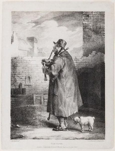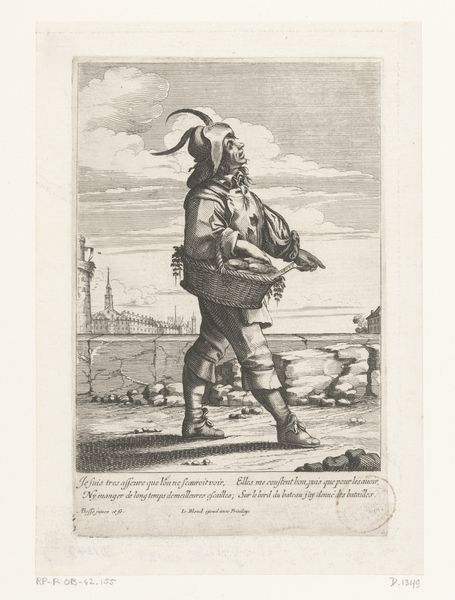 Curator: Look at this, will you? "Straatmuzikant," dating from 1629-1630, an engraving by Abraham Bosse here at the Rijksmuseum. Editor: It's the visual equivalent of a slightly out-of-tune melody played on a rickety instrument. Simultaneously charming and just a tad melancholic, don't you think? Curator: I’d say so. It’s the quintessential image of a traveling street musician from that era. Bosse was clearly fascinated with the lives of ordinary people. The print is just incredibly detailed. Look at the texture he's managed to capture on that worn cloak. Editor: The cloak itself is laden with symbolic weight. A worn-out cloak suggesting a wandering, unstable existence…it speaks volumes. Even the little shoes! Curator: And then the composition! The musician, the centre of attention of course, set against that stone wall where a small crowd are gathered, drawn to the music. What catches my eye are those figures lurking just behind it. Are they entertained or simply curious? Editor: More than entertained, I see captured. The children behind the wall are leaning forward. To me, Bosse's imagery speaks about how we're all naturally drawn to storytelling. We look for that "something more" in the daily routine, whatever form that takes, in this case music! Curator: A story of fleeting connection through art, beautifully portrayed. Editor: Exactly! And to think how, centuries later, we can still pause and reflect on such fleeting moment thanks to pieces like these… Curator: Well said. A snapshot of a bygone era with a resonance that’s utterly timeless.