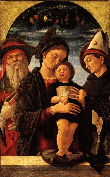 Curator: I find myself captivated by the composition. Pontormo’s Madonna and Child with the Young Saint John, created around 1524, presents a fascinating tableau. Editor: Yes, there’s an unsettling stillness. The disproportion, the oddly muted palette…it verges on haunting, doesn't it? Curator: Consider the historical context. Mannerism emerged in a time of religious and political upheaval. How did this anxiety permeate the materials, the artistic choices made during production? Editor: The elongated figures, that strange sense of weightlessness – it speaks to the artificiality inherent in Mannerist aesthetics. It feels self-consciously stylized. Look at the way the Madonna's hand awkwardly cradles the Christ Child. Curator: And let's consider the labor involved. These weren't mere religious exercises. The commissioning, the pigment preparation, the apprenticeship system… all embedded in a complex social fabric. The work reflects those power dynamics. Editor: Undoubtedly, the patronage shaped its creation, yet I’m most intrigued by Pontormo’s handling of paint itself. Observe how the soft modeling of faces contrasts with the almost sculptural quality of the drapery. What do you make of the odd, architectural shapes in the landscape background? They seem as emotionally fraught as the foreground figures. Curator: The availability of specific pigments would influence the palette too. Ultramarine blues, for example, were costly. Their usage signified wealth. We also mustn't overlook how trade routes facilitated material exchanges. This painting wasn’t born in a vacuum; it’s the result of economic forces. Editor: Absolutely, and knowing that, one cannot ignore how that odd coloration gives it such a unique feel, almost other-worldly, perhaps, but equally melancholic and deeply human in their subtle interplay of gesture and gaze. Curator: I agree. By acknowledging the labor and market, the socioeconomic elements behind art, we move beyond idealised notions and gain a more truthful experience of our existence and history. Editor: True, and the effect this materiality produces leads one to reflect on the artfulness within these images. Their aesthetic arrangement serves as a potent signifier of profound artistic intentions.