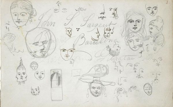 Editor: This is "Studies van gezichten," or "Studies of Faces," a drawing by Paulus Pontius from between 1616 and 1657. It feels like a glimpse into the artist's process, a sheet filled with exploratory sketches. What stands out to you? Curator: The page vibrates with symbolic echoes. Do you see how Pontius employs geometry – the squares, triangles, and circles superimposed on these faces? It's not just about accurate representation. Consider how these shapes were perceived then: as embodiments of cosmic harmony, divine order made visible. Editor: So, the geometric frameworks are about more than just proportion? Curator: Exactly. Look at how some faces seem idealized, almost angelic, while others have a more earthly, even grotesque quality. Aren't these contrasts an exploration of the range of human experience, a dance between the ideal and the real? Think about the cultural memory embedded in each face. What stories do they hold? Editor: It’s interesting to think about these faces as vessels for broader cultural ideas, not just portraits. Do you think the fact that it's a sketch changes that? Curator: Perhaps it amplifies it. A sketch reveals the artist's thought process, their engagement with those symbols. These are studies, yes, but they are also a testing ground for the cultural meanings embedded in the human face, a way of invoking history, psychology, and myth all at once. Editor: I've always looked at sketches as practice, but thinking of them as a way of actively engaging with cultural symbols opens a whole new way to view them. Curator: Precisely! Each line becomes a dialogue with tradition, a negotiation between personal expression and shared cultural memory.