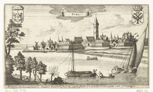 Curator: Welcome! We are standing before "Gezicht op Rhenen," an engraving from sometime between 1692 and 1714, currently held at the Rijksmuseum. The work is attributed to Thomas Doesburgh. Editor: It’s incredible the amount of detail rendered in what looks like an almost clinically precise, light-drenched scene. The composition feels balanced but static, like a stage set. Curator: It’s interesting that you note that, as I think understanding the labor and tools is important here. As a print, it's likely meant for widespread consumption. Doesburgh had to meticulously create a plate for printing, indicating a specialized, artisanal skill serving early Dutch capitalism by rendering cities desirable and thus economically viable. Editor: Absolutely. The composition, organized with such clarity and geometric precision, reflects more than simple commerce; note how he renders each structural component! The windmills, the church tower, the boats on the river—each object has its own discrete integrity. How Doesburgh achieves this with such subtle gradations of line weight is fascinating. Curator: Right, consider also that paper, ink, and the printing press all are elements in its production and dissemination. The affordability of prints compared to paintings enabled a broader audience to engage with art, challenging the elite art patronage system. Editor: I appreciate the formal tension between the calm skyline of Rhenen and the dynamic details of daily life, which offers this very satisfying sense of spatial organization, you know, this beautiful tension between foreground and background. Curator: It's compelling to consider how prints like these also acted as records of specific urban identities. The emphasis is not just aesthetic; it demonstrates Rhenen’s social structure and the lives of its residents, rendered within the frame of burgeoning economic activities. Editor: Well, considering our discussion, I have renewed interest in revisiting the way it so brilliantly portrays this cultural ethos by aesthetic form, almost as though form and purpose, art and commerce, find true confluence in this print. Curator: Indeed, thinking about the work in terms of its function as visual document is compelling as well, as the social meaning imbued through it provides much food for thought.