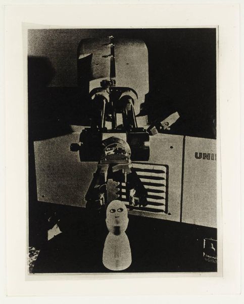 Editor: Here we have Eduardo Paolozzi's "Manikins for Destruction: Untitled (Broken Open Dummy Skeleton)." It’s a black and white image, quite small, depicting what looks like a broken mannequin. What draws your eye when you look at this work? Curator: The layering of materials and their apparent purpose is key. The dummy, the metal frame, all imply mass production and function. But broken, they speak to the fragility of these systems and the human cost embedded in their creation and potential destruction. Editor: So, you see the broken mannequin as a comment on the system of production itself? Curator: Precisely. Consider the labor involved in creating both the dummy and the apparatus. Paolozzi pushes us to question what these objects represent beyond their initial function. Editor: I see, the focus shifts from the object itself to the process of its creation and its role in a larger system. Curator: Exactly. Hopefully, listeners can explore that tension through Paolozzi’s work.