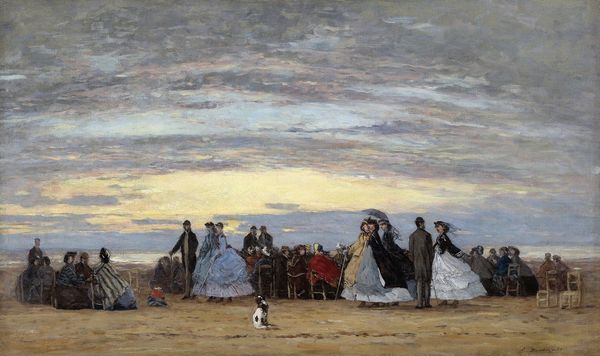 Curator: Eugène Boudin’s “On the Beach, Sunset,” created in 1865 using oil paints and adopting the innovative “plein-air” technique, offers a fascinating snapshot into leisure and social life. Editor: The subdued color palette strikes me first—a dreamy combination of pastel blues, yellows, and browns, creating a tranquil, almost melancholic mood. The soft light suggests a fleeting moment at dusk. Curator: The painting captures a group of figures elegantly dressed on a beach in France. Looking beyond aesthetics, we can see this image functions as a potent signifier of class and gender in mid-19th century France. The beach, a space increasingly available, though on unequal terms, becomes a site for performing bourgeois identity. Editor: Agreed. Boudin masterfully employs composition to draw attention to the various groups within the social scene. See how the figures closest to the left border are grouped closer and larger to the spectator, while other groups and solitary figures shrink back in space. Curator: The “genre painting” nature, and Boudin's style more broadly, challenges earlier conventions of history painting. By focusing on everyday life, he provides valuable insights into the lived experiences of a particular class at a particular moment. Consider, for instance, how gender norms dictate their attire and activities. Editor: The interplay of light and shadow is also critical. Notice the horizon line separating sea and sky--it is the background and setting to the staging of people in elegant garments that otherwise do not blend in tonally. The effect, through the careful blending of tones, allows the sunset hues to bathe the gathering, softening any stark social critique. Curator: True, the painting aestheticizes this reality to some extent, potentially glossing over deeper inequalities. The sea functions here not just as picturesque scenery but also as an escape, limited only to certain groups. Editor: Exactly, its charm lies precisely in this ambiguous space—the painting captures the serene beauty of a sunset scene while hinting at complex societal layers beneath the surface. It transcends a mere visual delight, prompting deeper reflection on the themes of class, temporality and representation itself. Curator: Precisely. "On the Beach, Sunset" encapsulates a specific social, cultural, and political context through Boudin's Impressionist sensibilities. It beckons us to explore its multilayered meanings.