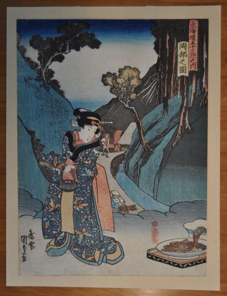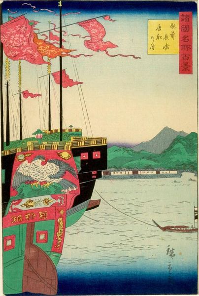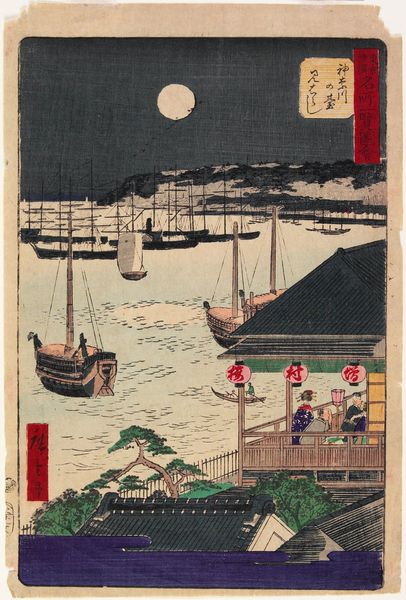 Utagawa Kunisada created this woodblock print, "View of Arai," using a distinctly collaborative process. The image, made with carved wood blocks inked and pressed onto paper, involved the skilled labor of multiple artisans. Kunisada’s design was translated into wooden printing blocks by expert carvers, each responsible for a different color layer. Then, highly skilled printers would apply ink and align the blocks precisely to create the final image. The texture and layering of colors achieved through this method is distinctive, especially in the patterning of the woman’s kimono. As you look closely, notice how the lines and colors work together to create depth and detail, from the figures in the boats to the distant mountains. The production of these prints was tied to a flourishing commercial market, catering to a public eager for images of fashionable life and scenic views. By considering the processes and the hands involved, we gain a deeper appreciation for this artwork, recognizing it as a product of collective skill and cultural exchange.