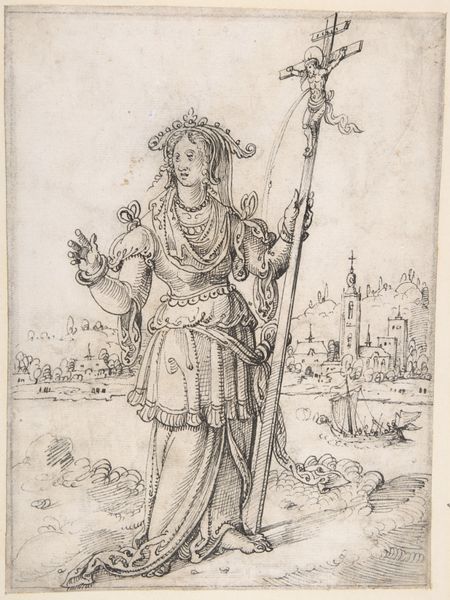 Editor: We're looking at a Renaissance engraving, circa 1515 to 1525, titled "Pallas Athena standing on a globe, holding a spear in her left hand and her shield in her right," currently held at the Metropolitan Museum of Art. The fine, linear detail creates a strong sense of depth, even though the shading is minimal. What are your observations on the artist’s construction of form? Curator: Note the figure’s pose: her weight distributed atop a sphere. See how the engraver uses line weight to describe volume in Athena’s drapery, particularly around her legs. The complex interplay of light and shadow is achieved almost entirely through line and cross-hatching, yet the figure has significant three-dimensionality. How would you describe the articulation of Athena's muscles? Editor: Well, I notice the muscularity feels a bit exaggerated, perhaps even idealized? Is that common for the period? Curator: Precisely. This is a visual language informed by classical ideals, prioritizing idealized forms over naturalistic accuracy. Consider also the arrangement of forms; the globe is opposed by the helmet's crest and spear-tip to create visual dynamism. The entire composition is carefully calibrated to produce an effect of balanced tension. What inferences can you make by the direction of her gaze? Editor: She's gazing outwards, directing our attention beyond the image. I now notice how her contrapposto stance—weight shifted on one leg—creates movement. Curator: Indeed. The slight turn of her torso adds another layer of visual complexity and interest, drawing the viewer's eye throughout the entire composition. This close study reminds us how artists use specific techniques to create layered interpretations within a single work. Editor: I appreciate the nuances I've noticed by understanding the balance between form and content that underscores the power this artwork carries.