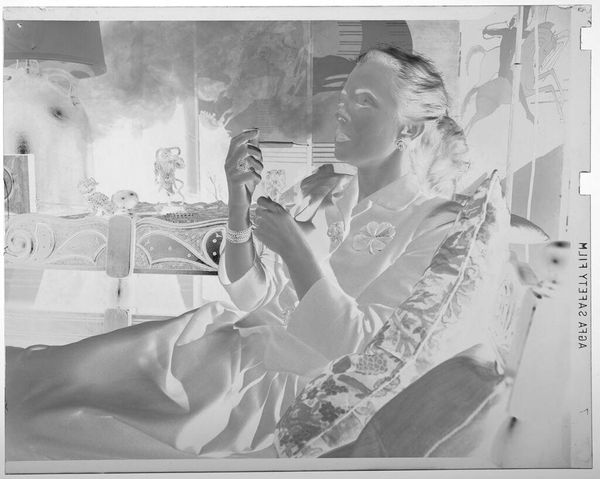 Editor: Here we have an untitled photograph by Jack Gould of a woman smoking a pipe. It's intriguing because of the smoke's presence around her face. What do you make of it? Curator: I'm drawn to the materiality of the image itself. As a photographic negative, it reveals the chemical processes involved in its creation. Consider the labor behind its production, from the photographer to the darkroom technicians. What social narratives are embedded in this image of leisure and consumption? Editor: That's a different way to look at it! I was focused on the subject. Curator: The subject is important, but also think about what is not shown. What are the means of procuring tobacco and photographic materials? What does the image reveal about class and gender roles of the era? Editor: I see. It’s more than just a portrait; it’s a record of a specific moment with a whole system of production behind it. Thanks!