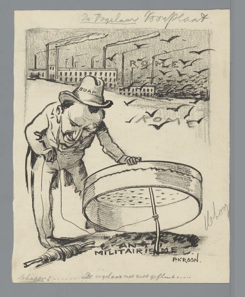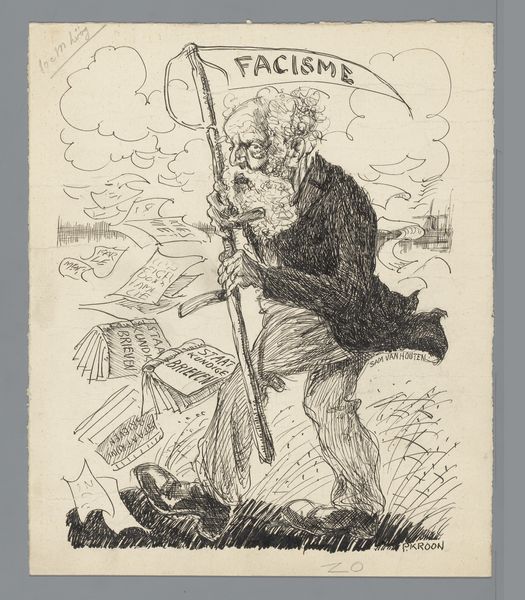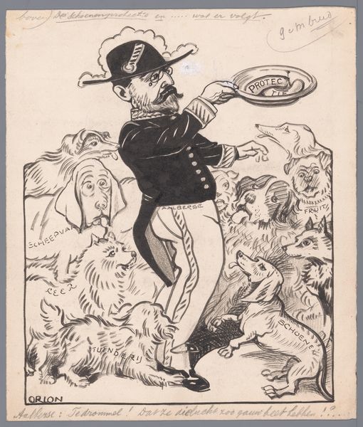 Curator: Ah, this is an interesting piece: "Cort van de Linden en de openbaarheid" by Patricq Kroon, likely dating from between 1920 and 1930. It's a drawing, made with pen and ink. Editor: My first impression is that it's a satirical piece, very quirky and expressive with that linework! There's something quite biting about the visual pun going on here. Curator: Absolutely. The figure, presumably van de Linden himself, appears as a rather old-fashioned gentleman, formally dressed with a top hat. He's gesturing towards a doghouse labeled "Patria," while a dish labeled "Openbaarheid" sits empty before him. The dog inside the house has a very burdened, maybe even suspicious, look on its face. Editor: And notice how Kroon uses hatching and cross-hatching to create a sense of depth and shadow, particularly around the face of van de Linden and the doghouse. The slight application of blue as well makes the cartoon characterization more subtle, like a melancholic memory. It avoids simple caricature in favor of something sadder, a sense of failure. Curator: The symbols are potent. The "Patria" doghouse immediately evokes ideas of nationalism, of home and belonging. But what does it mean when openbareheid, public affairs, sits neglected like empty slop, as if a sacrifice has been demanded by 'the fatherland?' The dog's position suggests "Patria" as a kind of restriction, a confined and surveilled loyalty. Editor: Exactly! The dish is placed so literally at van de Linden's feet, he seems oblivious. The open dish becomes a kind of symbol itself. Even in the rough style of this artwork, that placement is important. Is van de Linden ignoring the common people, the public that is clearly "below" him? Or maybe is that the very caricature? Curator: It’s compelling how Kroon uses what seems like a simple sketch to convey such complex political ideas about nationhood and the public sphere in early 20th century Holland. One almost expects the image to jump into motion. Editor: Yes, a deceptively simple composition. The spatial arrangement forces us to ask uncomfortable questions. Curator: Well, it’s been really eye-opening to look at this satirical statement and unpack some of the themes within it, wouldn't you agree? Editor: Certainly. Kroon's piece feels strikingly resonant still. A good reminder that these images always possess relevance across generations.