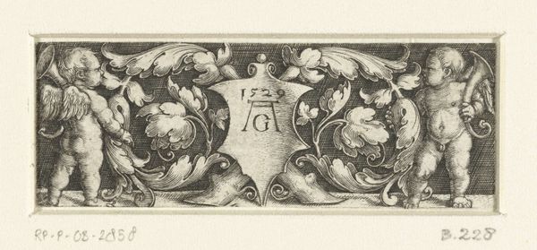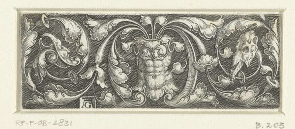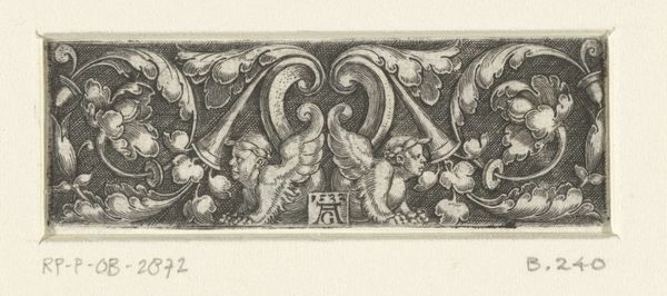 Editor: This is "Fries met twee dolfijnen en twee bladranken," or "Frieze with two dolphins and two leaf tendrils," created between 1512 and 1560 by Heinrich Aldegrever. It's a small engraving from the Rijksmuseum. I'm immediately struck by the almost playful symmetry of the dolphins and foliage. What deeper significance might we find in this ornamental design? Curator: It’s fascinating to consider this engraving within the context of the Northern Renaissance and the burgeoning print culture. How do you think the use of dolphins, often symbols of transformation and safe passage, speak to the social anxieties and shifting identities of the time? Editor: I hadn’t thought of it like that! Maybe the dolphins represented a hope for safe passage through social and political upheaval? What about the function of ornament itself during this period? Curator: Ornament in the Renaissance served multiple functions. It signified status and taste, certainly. But it was also deeply connected to the era’s rediscovery of classical forms and philosophies. Consider how Aldegrever is deploying these classical motifs – how does that reflect the era's attempts to reconcile pagan imagery with Christian beliefs? Editor: So it's not just decorative, it’s also about integrating a pre-Christian past into their present worldview? Curator: Exactly! And remember, prints like these were relatively affordable. They made classical imagery accessible to a broader audience, impacting design and thinking throughout society. The image of dolphins could be seen on furniture or used in the decoration of homes of people that were rising middle-class. In essence, they helped disseminate these new cultural ideals. How do you view its cultural impact given this wider accessibility? Editor: It gives me a lot to think about; the cultural implications far outweigh its decorative function. Thanks! Curator: Agreed. It highlights how a seemingly simple design element can hold complex cultural significance, reflecting larger shifts in worldview.
