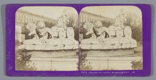 Curator: What a captivating image! We’re looking at a photograph titled "Scuptuur van Thaleia op het Plaza de Isabel II te Madrid", dating roughly between 1862 and 1876, attributed to Jean Andrieu. Editor: It's striking. The classical figure, likely marble or a similar material, dominates the frame, perched atop its pedestal. The monochrome tones create a somber yet dignified atmosphere. I wonder what kind of tools they used for the work on this sculpture. Curator: The sculpture represents Thalia, the muse of comedy and idyllic poetry. Consider how the plaza itself became a stage, a public space where classical ideals were embodied, reinforcing the cultural values of the time under Isabel II's reign. Editor: That's interesting because the choice of subject then shapes the stone itself. Was it local stone? Was it quarried nearby, or imported from elsewhere? Its materiality connects the city not just to its past but to the immediate landscape and economics of acquiring it. Curator: Indeed. Andrieu’s photograph allows us to study this intersection. Photography itself, a relatively new medium, becomes a tool for disseminating and popularizing these artistic and political statements embedded within the sculpture. It becomes more widespread through photomechanical reproduction too. Editor: True, seeing the traces of hand work here would've told a story. I wonder about the hands of the sculptors and laborers, whose toil created this spectacle, their agency seemingly lost in the polished final product presented in a classical-looking photography print. Curator: I agree that the tension between artistic vision, labor, and political context is potent here. The sculpture represents official narratives. Editor: Absolutely. So, by studying the sculpture within this setting, we can peel back layers of social construction, revealing how power is manifested through art and public space, disseminated through media of the day. Curator: Thank you for that illuminating materialist lens. It's fascinating how this photograph freezes a moment in time, enabling us to unravel so many strands of history and meaning embedded in this sculptural monument. Editor: Likewise, it makes you question the stone itself, and the choices behind the work and how those impacted history. Hopefully, it leaves everyone pondering the stories held within material and photographic processes of our own time too!