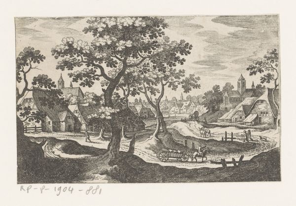 Curator: What a captivating image! Matthäus Merian's "Dorpsgezicht," dating from around 1603 to 1650 and held at the Rijksmuseum, presents a village scene rendered in meticulous detail. It's primarily crafted from drawing and engraving mediums. Editor: It's fascinating, isn’t it? I'm immediately struck by the contrast; it’s stark yet intricate, with the figures seeming almost incidental against this very precisely defined backdrop of buildings and trees. Almost as if the focus of this composition is not people at all. Curator: Exactly. The printmaking process itself, the use of ink and the act of engraving, became a form of social practice, connecting Merian to a network of craftsmen, printers and patrons who were all involved in the dissemination of knowledge and the visual documentation of the world. What are we actually looking at when observing images like this one and who was consuming such pieces? Editor: Indeed, it begs the question of who had access to it and for what purposes these images were made. Consider that prints like this, circulated widely, shaped perceptions of village life and Dutch identity in the period. Was it documentation, idealized fantasy, or propaganda, perhaps? Curator: Well, it's difficult to deny the artistry itself. Notice how the varying line weights give a sense of depth to the landscape, guiding your eye toward the village church in the distance. The materiality also makes it an interesting item: drawing and print, high art and craft merged into one! Editor: Right. The inclusion of everyday activities is also significant. People going about their lives, horse-drawn carts, interactions between community members—it all contributes to this wider narrative that, like broadsheets, contributed in building ideas of civic order. How did Merian see his role in crafting and reflecting reality? Curator: It definitely moves beyond pure representation, acting almost as a political statement regarding his role as an engraver of that time. It's as much about the physical making of an image and the context in which it existed as it is about what it represents on the surface. Editor: The intersection between materiality, method and consumption—that's how we uncover so many untold stories about art in society. This wasn't just art for art’s sake, I am convinced. Curator: A worthy reminder that the means of artistic production is itself an incredibly social and historical force that we have to consider when contextualizing artwork.