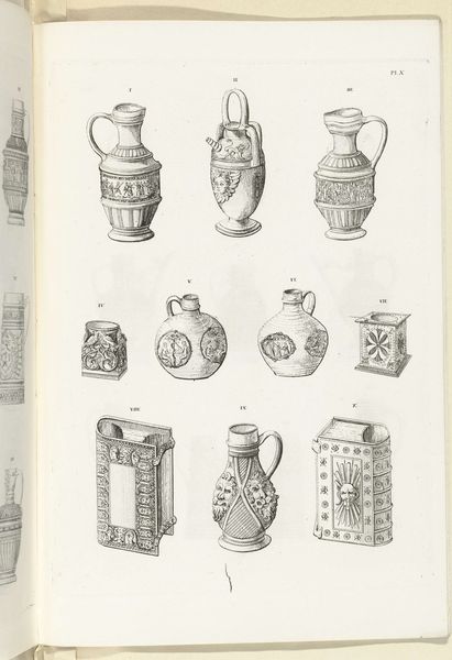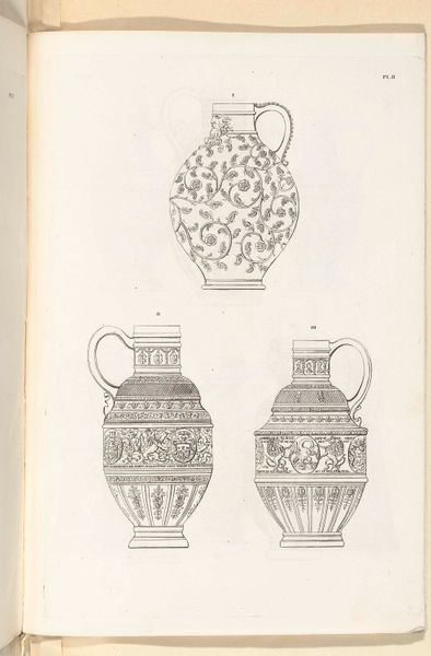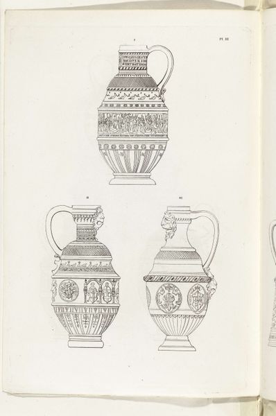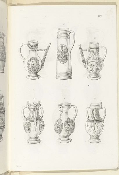 Charles Onghena made this lithograph print called 'Kannen van steengoed, plaat V'. Onghena was a Belgian artist in the 19th century, a period defined by burgeoning industrialization, nationalism, and colonialism. His detailed depiction of stoneware jugs provides insight into the cultural values attached to functional objects. These were times when the decorative arts were increasingly accessible to a broader public. Consider the jugs themselves: stoneware often reflects societal status and aspiration. They are embellished with classical motifs and heraldic symbols, echoing the aesthetics of aristocracy even as they were becoming commonplace. Details such as handles shaped as lion heads are of interest. What do they tell us about the intersection of art and social identity? These jugs, carefully rendered, invite us to reflect on the intimate relationship between everyday objects and cultural identity.