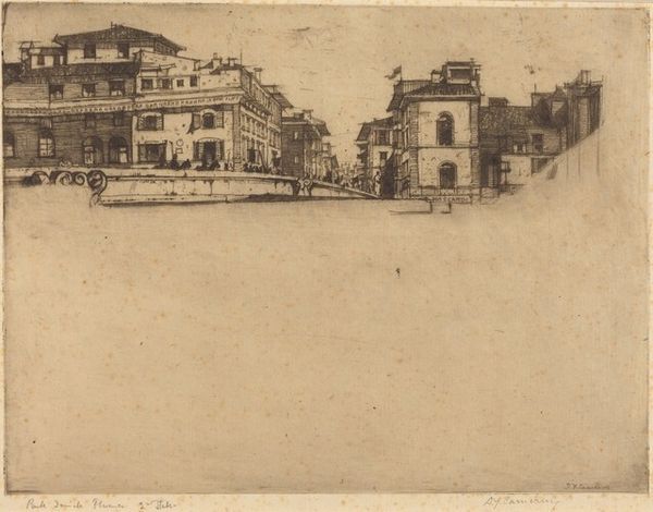 Curator: David Young Cameron’s 1899 etching, "Waterloo Place," offers a fascinating snapshot of London at the cusp of the 20th century. Editor: It’s remarkably evocative, isn't it? A kind of bustling emptiness… that open space in the foreground dominating everything, almost swallowing the distant figures. Curator: Exactly! The broad foreground invites a critical lens. The architecture and statuary signify imperial power, and it’s inescapable. Waterloo Place, commemorating victory, projects the narratives of Empire onto the urban landscape, doesn't it? Editor: I’m more drawn to the intricate detail within the seemingly simple composition. Look how Cameron uses line weight—heavy in the buildings, delicate in the sky—creating a sense of depth and atmospheric perspective. Curator: The people milling about... it’s impossible to ignore them. Consider the hierarchies being reified in this composition. Who had access to Waterloo Place? Whose narratives were, and continue to be, elevated by its presence? How does this artwork invite reflection about Britain's identity during a peak era of colonialism? Editor: See the geometry though? Those imposing classical facades, balanced by the delicate lines of the overhead wires... such compelling use of contrasts, a harmony almost. Curator: The "harmony," I suspect, conceals a deep unease—an emerging tension in class structures and the burdens of Empire. That looming statue, arms outstretched... Is it beckoning or relinquishing power? What burden does the patriarchy hold in a piece like this? Editor: It’s undoubtedly thought-provoking from a purely aesthetic point too, of course. The overall effect is almost dreamlike, despite its detailed representation. Curator: It reveals a landscape burdened by its history. "Waterloo Place" isn't just a pretty cityscape; it’s an invitation to investigate the complex negotiations of power, representation, and identity at the close of the Victorian era. Editor: It also makes you appreciate the artistic choices, the considered mark-making that goes into constructing that image and those meanings, even a century on.