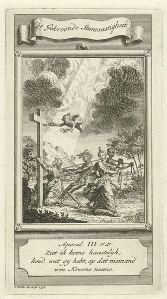 Editor: This engraving is the title page for the Europische Mercurius of 1748. It's rendered in that distinctive, detailed Baroque style. There is so much going on—allegorical figures, a detailed landscape, and it’s clearly designed for mass production. What can you tell me about it? Curator: Let's focus on the process of creating a print like this in 1748. Engraving was labor-intensive. Someone, likely multiple artisans, meticulously cut lines into a metal plate. We have to consider their skills, the time invested, and the socio-economic implications of such specialized labor. How do you think the engraver's social status might influence the work? Editor: I hadn’t thought of it that way, I suppose being a skilled artisan, they’d have a certain standing, yet remain dependent on patrons or publishers like Van Gerrevink. Would the type of metal used for the plate affect the quality and lifespan of the prints? Curator: Precisely! The choice of material—copper or steel, for example—directly impacts the number of impressions that can be made before the plate degrades. And what about the ink? Consider its composition, source, and how that contributes to the final image we see. Furthermore, the print facilitated distribution of information, reflecting a growing commercialization and public sphere. Do you think the artist made the right choices about the paper and ink? Editor: The print looks very clear; so, it must be adequate materials. So, from a materialist perspective, even an allegorical image speaks to the economics and labor conditions of its creation, right? Curator: Absolutely! This engraving isn't just about allegory, it's about material production, consumption, and the circulation of ideas within a specific historical context. We must ask what was this publication really about? How would that information have benefitted the people? How was it distributed, received, and acted upon? What power structures are at play? Editor: That’s given me a whole new way to look at prints! It is far more complicated than I considered.