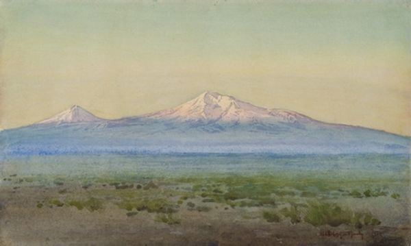 Editor: Here we have Aivazovsky’s "Araks River and Ararat," painted in 1875, rendered in oil. The sheer scale of the landscape gives it a really awe-inspiring, almost reverential, feel. What stands out to you, structurally? Curator: I am immediately drawn to the composition. Note how the horizon line is placed relatively high, emphasizing the immensity of the sky and the mountains. This contributes to a sense of sublime vastness, aligning with Romantic ideals. Consider, also, the artist’s use of atmospheric perspective. Editor: The way the colors fade and blur in the distance? Curator: Precisely. This blurring technique suggests an infinite depth and contributes to the emotional resonance of the work. Ask yourself: How does Aivazovsky manipulate color to direct your eye? Editor: It seems the warmer, earthier tones in the foreground lead you back towards the cooler blues and whites of the mountain peaks, drawing the eye upward. Also, the sharp contrast makes the painting stand out. Curator: Observe the materiality as well. Oil paint allows Aivazovsky to build layers of translucent glazes. Note especially in the rendering of the sky, how these glazes create a luminous quality. It is, after all, in these painterly manipulations that the artistic endeavor resides. Editor: So, it’s not just about representing the landscape, but also about the way the paint itself contributes to the overall effect? Curator: Exactly. The physical qualities of the medium actively shape our perception and emotional engagement with the scene. What new insights have you gleaned? Editor: I realize that analysing colour, depth, and even the layering of the oil paints helps one read how it all blends together into one striking romantic painting.