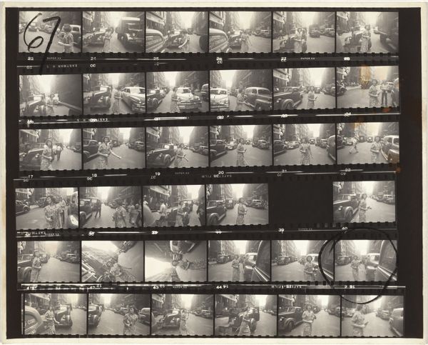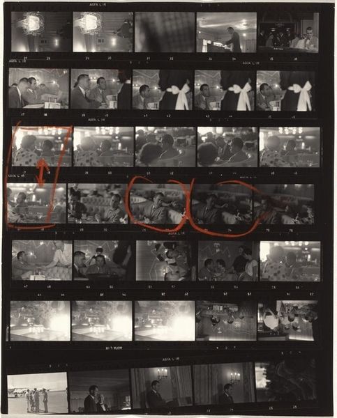 This is Robert Frank's filmstrip, shot somewhere, sometime, with his camera, and it looks like it's contact-printed on paper. I love seeing a filmstrip like this. It feels so raw and process-oriented, right? The high contrast, the way the edges of the filmstrip are visible, it's all about the materiality of photography. You get this sense of Frank's hand in it, his choices. There's a real intimacy to this piece, like we're peeking into his personal life, his family, maybe even his mind. Look at the sequence in the middle. A child, a cat, some food. It's like he's trying to capture a fleeting moment, a feeling. The graininess of the image adds to that sense of immediacy, like he's just grabbed a quick snapshot. It reminds me a bit of Garry Winogrand's street photography, that same off-the-cuff, slice-of-life vibe. And just like a Winogrand, this piece embraces the ambiguity, the messiness of life. It's not about perfection; it's about capturing a feeling, a mood, a moment in time.