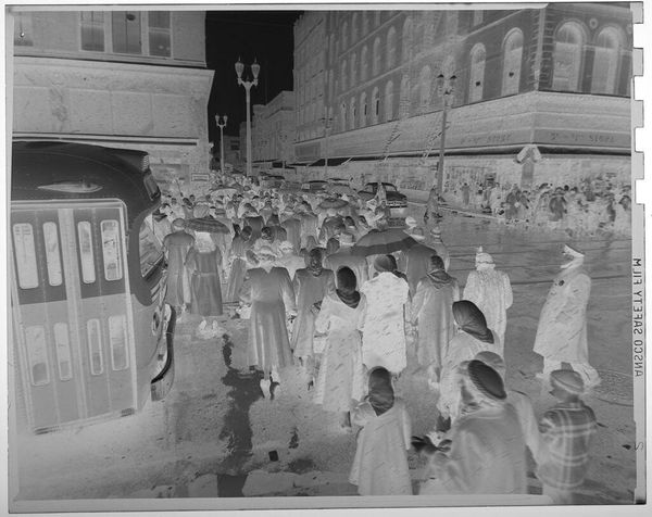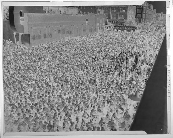 Editor: Here we have Harry Annas's "Untitled," showing a crowd watching a band play. It’s a black and white photograph, quite small. It makes me think about community and shared experiences. What can you tell me about it? Curator: This photograph invites us to consider the socio-economic conditions that enable such a gathering. The photographic process itself, the availability of film, the labor involved in developing the image… these factors are crucial. Consider how access to these resources shapes who can document and participate in cultural memory. Editor: That’s an interesting point. So, the image isn't just about the event, but also about who had the means to record it? Curator: Exactly. It prompts questions about power, representation, and the very materiality of image-making. What is seen and unseen due to the means of production? Editor: I never thought about it that way. It adds a whole new layer to understanding the image. Thanks! Curator: My pleasure. It’s all about uncovering the hidden narratives within the materials and processes.