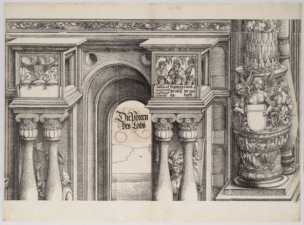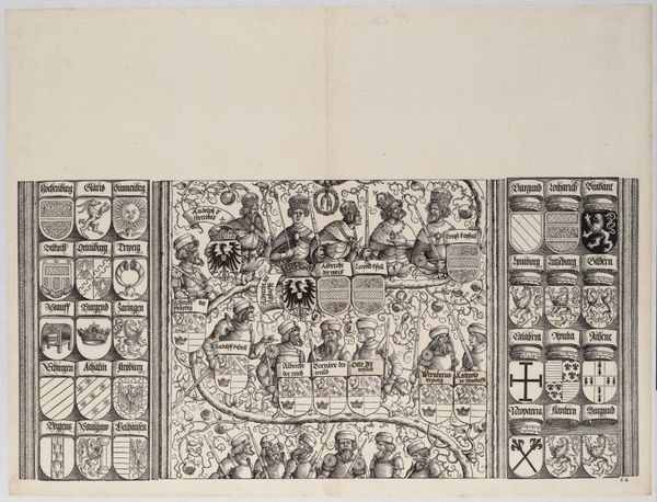 Curator: The piece before us, held at the Metropolitan Museum of Art, is entitled "The Upper Portion of the Genealogy of Maximilian; with the Right Edge of the Scroll for the Explanatory Text, from the Arch of Honor, proof," dating from 1515 to 1517. It's a woodcut and engraving by Hans Springinklee. Editor: An incredibly intricate composition. My immediate response is one of awe at the density of visual information, the heraldry… and a touch of the archaic. It feels deeply embedded in a very particular time and system of power. Curator: Indeed, the organizational structure is key here. The heraldic shields flanking the central figure display an intense formal balance. Observe the textures achieved solely through line work, the controlled use of hatching and cross-hatching creating tonal variations, especially evident in Maximilian’s armor and within the woven floral motifs that surround him. Editor: And those symbols… each crest telling a story. You get a powerful sense of dynasty, legacy, a kind of deliberate construction of history through the visual language of power. Look at the recurring motif of the imperial eagle. And how it leads the eyes upwards to the title scrool—an insistence on lineage and divine right. Curator: Semiotically rich, wouldn’t you say? Springinklee orchestrates a complex interplay between figure and ground; the meticulous attention to detail distracts viewers from any single focal point. The result is an experience that mimics how such complex ideologies permeate a culture: unavoidable, interconnected, and overwhelming in its sheer volume. Editor: Overwhelming but also considered. The balance of masculine and feminine symbolism too - observe the allegorical figures - both reinforce and maybe even subtly subvert contemporary views of power in the Northern Renaissance court? It makes you question the narratives being woven, not just accept them. Curator: That interplay, as you point out, opens up further interpretations. Though intended as pure propaganda, the details invite continued formal analysis beyond simple subject recognition. The craftsmanship stands alone. Editor: Absolutely, and I think that is precisely why these symbols, designed to wield power in their time, can still trigger complex associations and reflection even for us today. A lot is retained, even after so long.